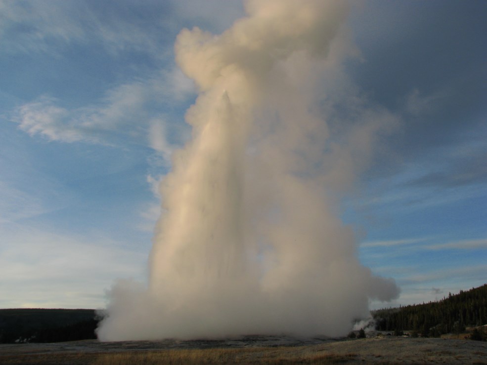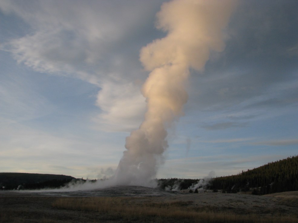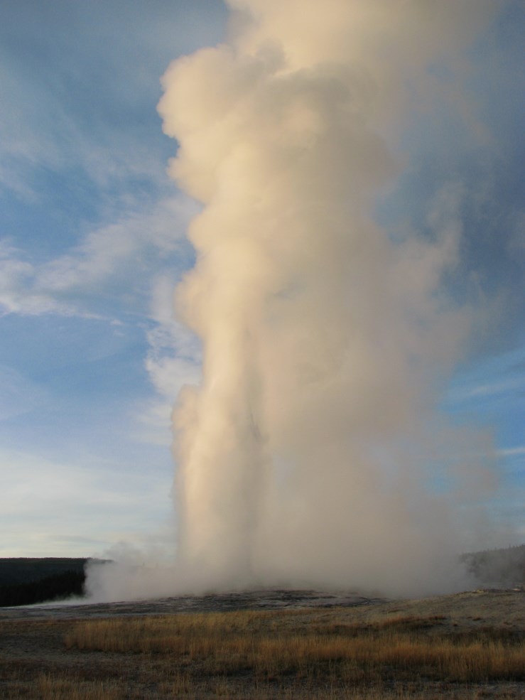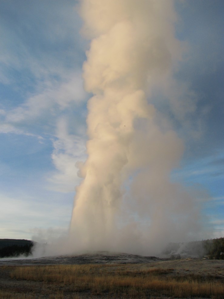 Andiamo infine fino al Geyser più bello del parco, l'Old Faithful, uno dei più famosi al mondo, le sue eruzioni durano dal minuto e mezzo fino a 5 minuti, a intervalli di 65-92 minuti, il getto d'acqua varia dai 30 ai 55 metri e vengono espulsi 14.000 ai 32.000 litri d'acqua.
