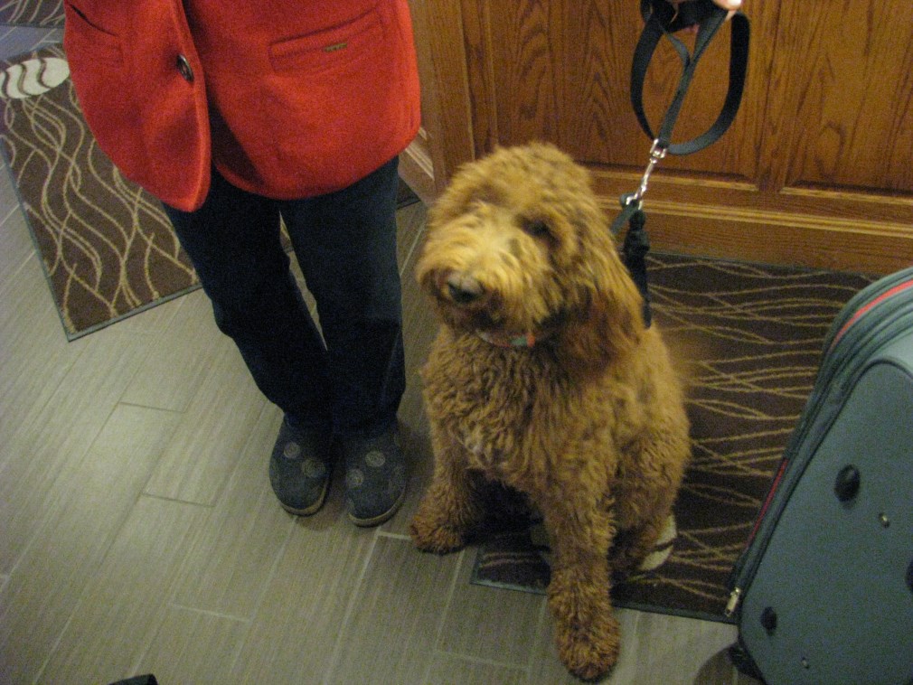 Mentre faccio la coda per il check in incontro una coppia con un cane fantatico, scopriremo dopo che il cane si chiama Penny (da Penelope) è un incrocio tra un barboncino e un labrador (in realtà tra un poodle e un labrador),  sembra quasi uno scherzo come in scemo e più scemo quando incrociarono un colly e uno spinone per ottenere un coglione , tuttavia se partiamo dal fatto che esiste il barbone (poodle in inglese stesso nome utilizzato sia per barbone e per barboncino) e viste le dimensioni del cane (Vedi foto), l'incrocio può esistere. Rimane comunque l'opzione che i barboncini maschi americani utilizzino la scala per riprodursi.  Penny è dolcissima e ci fa un sacco di feste, un pò come il mitico Ecler dei miei zii francesi. Il padrone di Penny è un simpatico pensionato del Minnesota, ci spiega che è venuto a trovare la nipote, la figlia del figlio, nata poche settimane fa, poi andranno per tre settimane a Palm Springs in California dove hanno una casa. Parliamo un po' del più e del meno, dell'Italia, di Venezia, della mafia, delle pensioni (lui è andato in pensione a 58 anni dopo 39 anni di lavoro, la moglie a 50, se ho ben capito in pre-pensionamento).