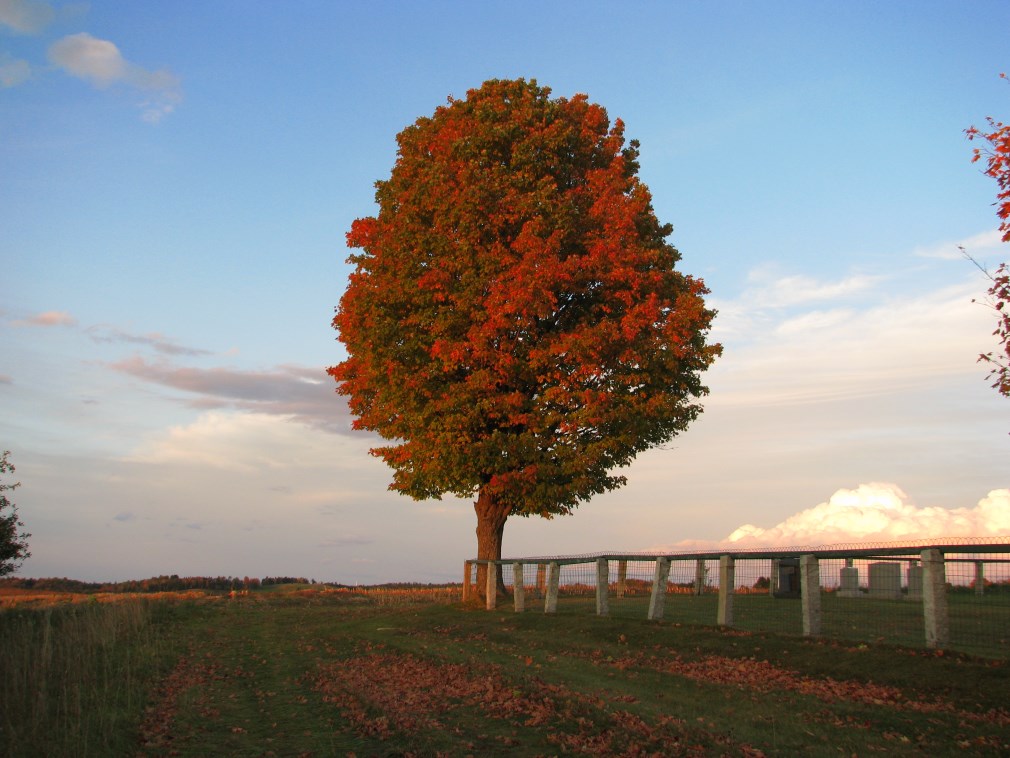 Subito dopo il confine usciamo dall'autostrada e saliamo su una collina per fotografare il foliage, scopriamo un cimitero bellissimo in cima ad una collina e ci godiamo un tramonto indimenticabile, 300 metri sotto di noi ci sono dei daini che brucano l'erba tranquilli.