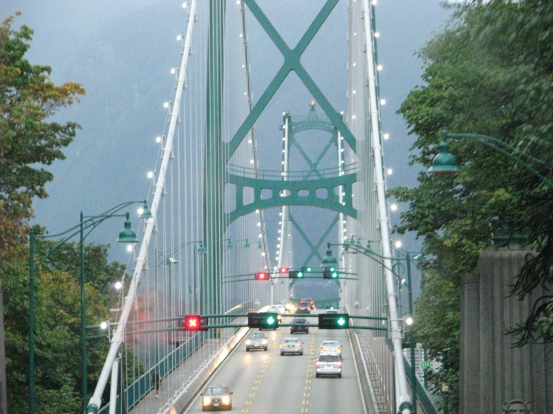 Presa l’auto e dopo aver ostiato un po’ contro i canadesi, attraversiamo il Lions Gate Bridge, una sorta di Golden Gate di Vancouver che attraversa la baia e raggiungiamo Vancouver Nord dove troviamo una camera al Comfort Inn. Notare che le corsie di uscita (e di accesso) alla città, (tre corsie) a seconda del traffico hanno diversi sensi di marcia a seconda di indicatori luminosi, per capirci la sera due corsie escono ed una entra, la mattina è il contrario, non male, purché le luci funzionino.