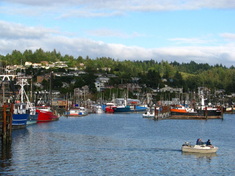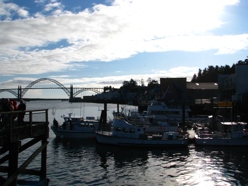 Ripartiamo alla volta del sud per andare verso il bel tempo, arrivati a Salem (capitale dell’Oregon) svoltiamo a destra e ci dirigiamo verso il Pacifico, mai scelta fu più azzeccata, dopo un centinaio di km raggiungiamo l’Oceano, la prima cittadina che incontriamo è Newport, con un centro cittadino lungo la costa ancora di inizio secolo scorso, davvero pittoresco, con numerosi edifici che hanno ormai 120 anni, appena scesi dall’auto ci colpisce subito l’odore di pesce, c’è una fabbrica che lavora il pesce e molti negozi che vendono pesce così come ristoranti. Andiamo sulla baia e lì vediamo dei pescatori di granchi con le loro nasse, mettono nelle nasse del pesce (non di bell’aspetto) le gettano in acqua e poi i granchi entrano per mangiare il pesce, poi tirano su  la nassa, tengono solo i granchi che superano una certa dimensione, direi sui 15 cm di diametro, gli altri li ributtano in mare, i granchi sono davvero enormi.