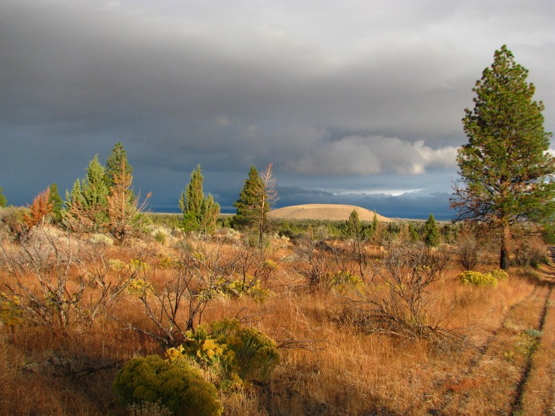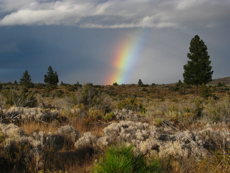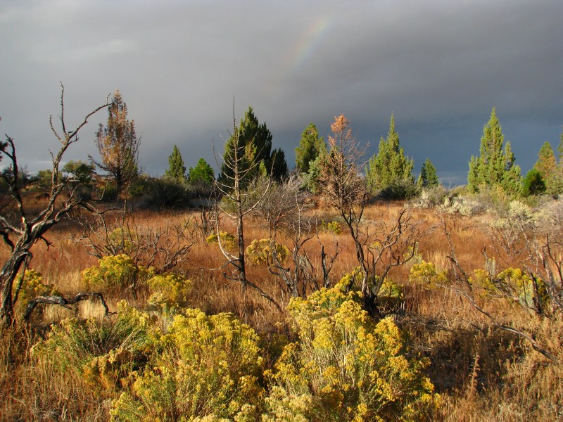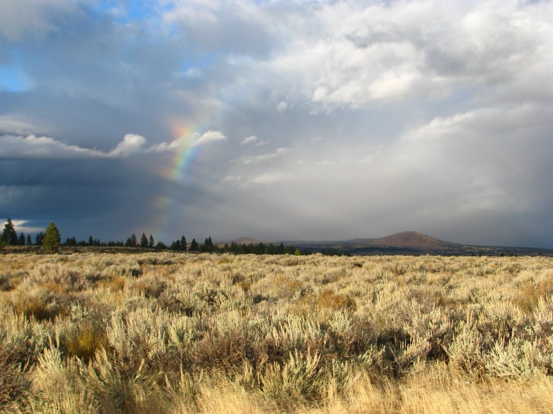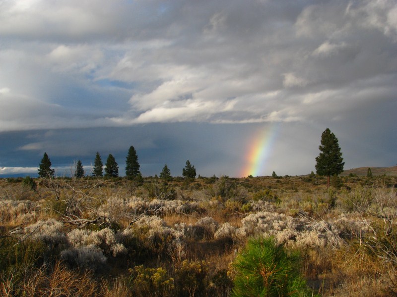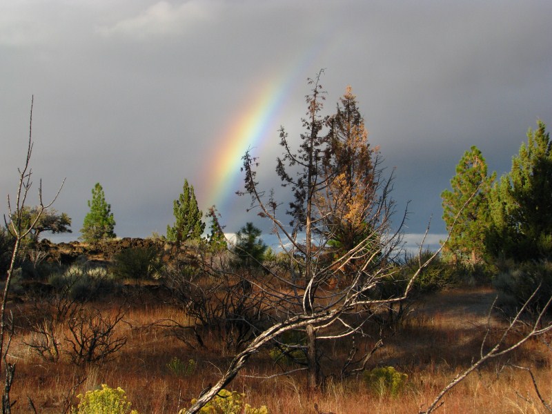 La perturbazione ci concede un break, il cielo si apre e possiamo ammirare un cielo azzurro solcato da nuvole basse e soprattutto da una lenticolare sopra un cono vulcanico, tipo quelle che si formano sul Monte Rainier o sullo Shasta (quest’ultimo un vulcano vicino alle Lava Beds che si eleva fino a quota 4317 metri. Restiamo stupiti dal tramonto, cielo azzurro, nuvole scure, arcobaleno, sole che illumina un vulcano, alberi che assumono colorazioni intense, solo questo tramonto valeva la vacanza, ho scattato foto tra le più belle che abbia mai fatto.