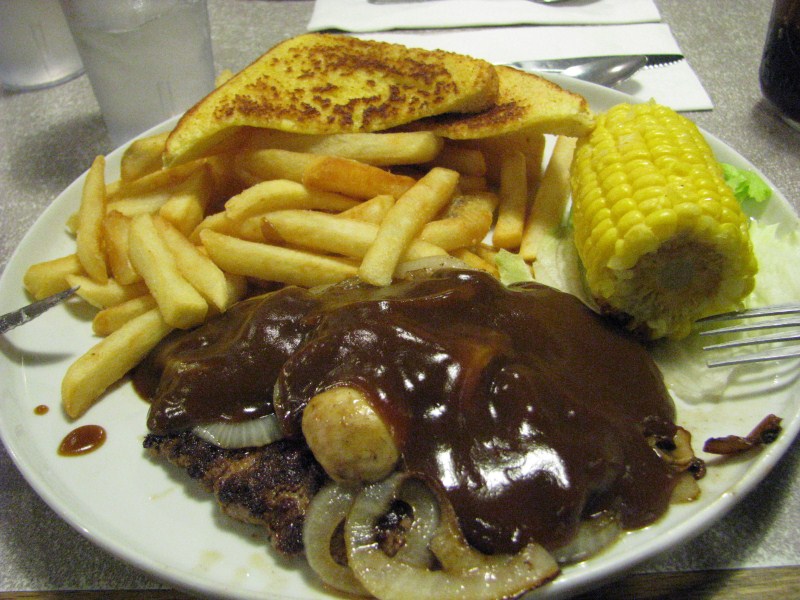 Arriviamo verso le 19 ad Alturas e troviamo alloggio in un Best Western (non che ci fossero 100 hotel, o questo o un Super 8), andiamo poi a cena in una bettola tipica vicino all’hotel, di quelle con gli sgabelli che guardano il bancone e dietro il bancone l’apertura che da sulla cucina direttamente, dove un cuoco con il berretto da baseball (potrebbe essere tranquillamente un camionista, un agricoltore o qualunque altra persona) ci prepara un piatto a base di hamburgher con 10 kg di salsa (vedi foto) patatine fritte, pannocchia, cipolle e funghi.