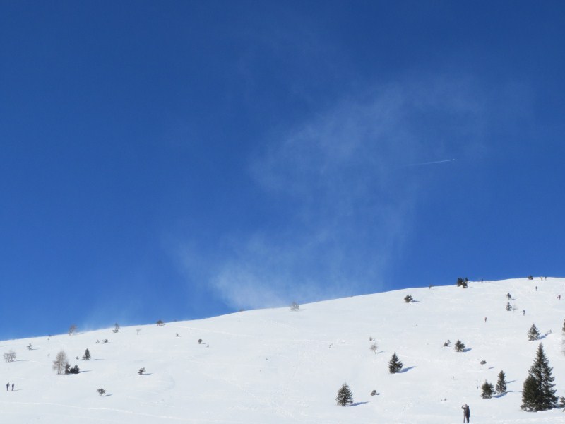 Bellissima escursione da Malga Larici (quota 1658 metri) a Cima Manderiolo (quota 2049 metri), unico problema il vento forte, il foehn, con raffiche fino a 68 km/h (in giornata in regione sono arrivate a 90 km/h) che hanno generato dei bellissimi "snow devil".