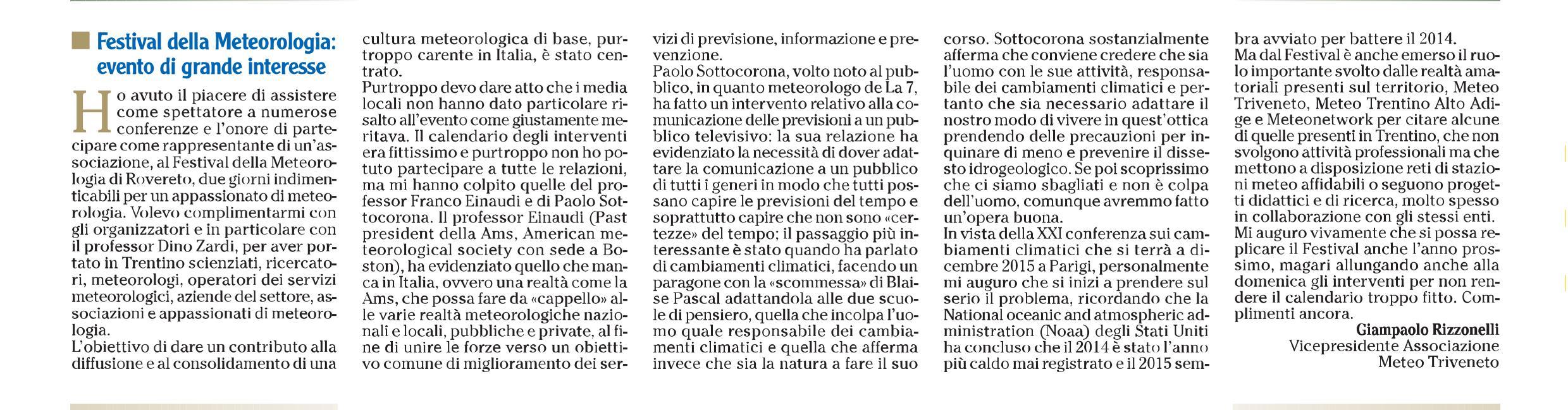 Lettera scritta da Giampaolo Rizzonelli in qualità di Vice Presidente di Meteo Triveneto e pubblicata dal quotidiano L'Adige a commento del Festival della Meteorologia.