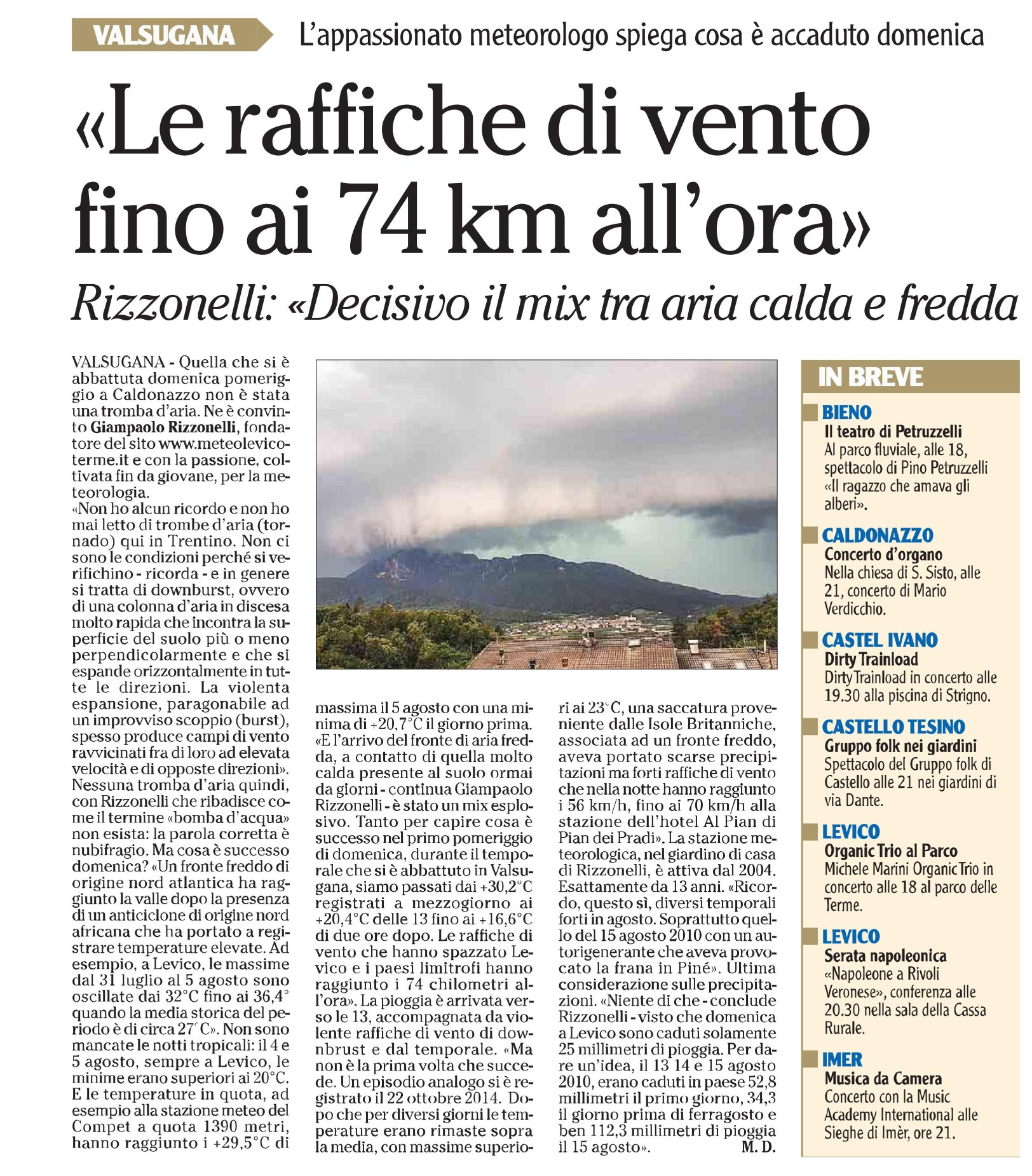 Articolo "intervista" relativo al temporale che ha colpito Levico Terme domenica 6 agosto