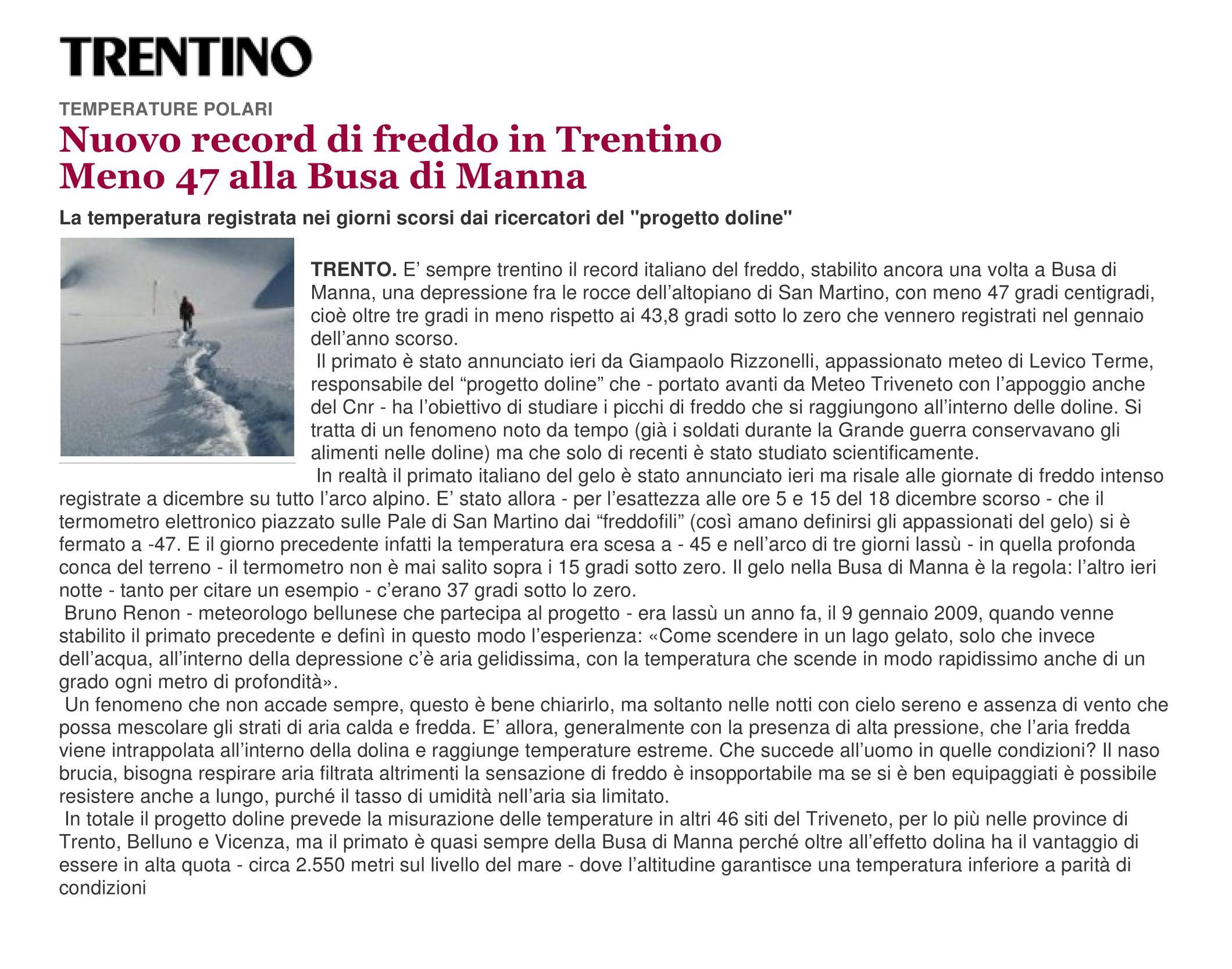 Articolo di Andrea Selva relativo al record di -43,8°C rilevato a Busa di Manna nell'ambito del progetto doline e siti freddi