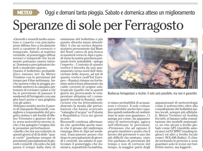 Intervista sul meteo di ferragosto a Giampaolo Rizzonelli sul quotidiano L'Adige