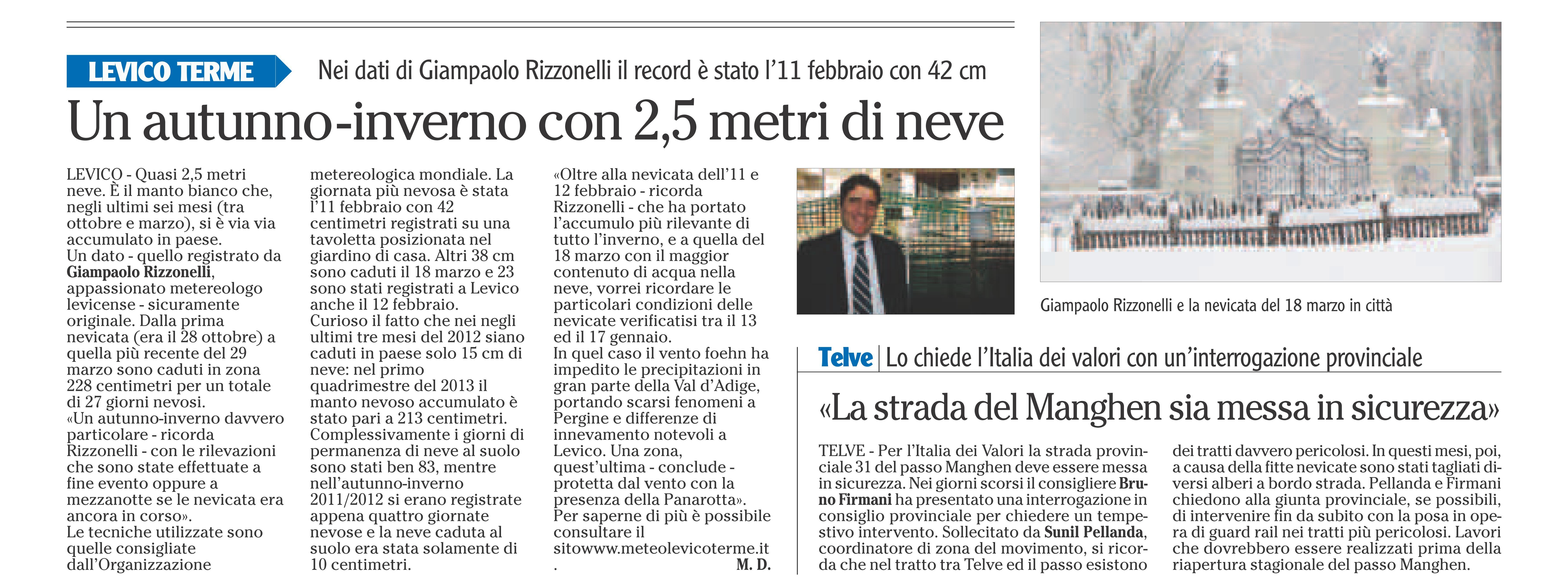 Articolo su tutti i 27 giorni nevosi che si sono succeduti a Levico Terme dal 28 ottobre al 29 marzo.
