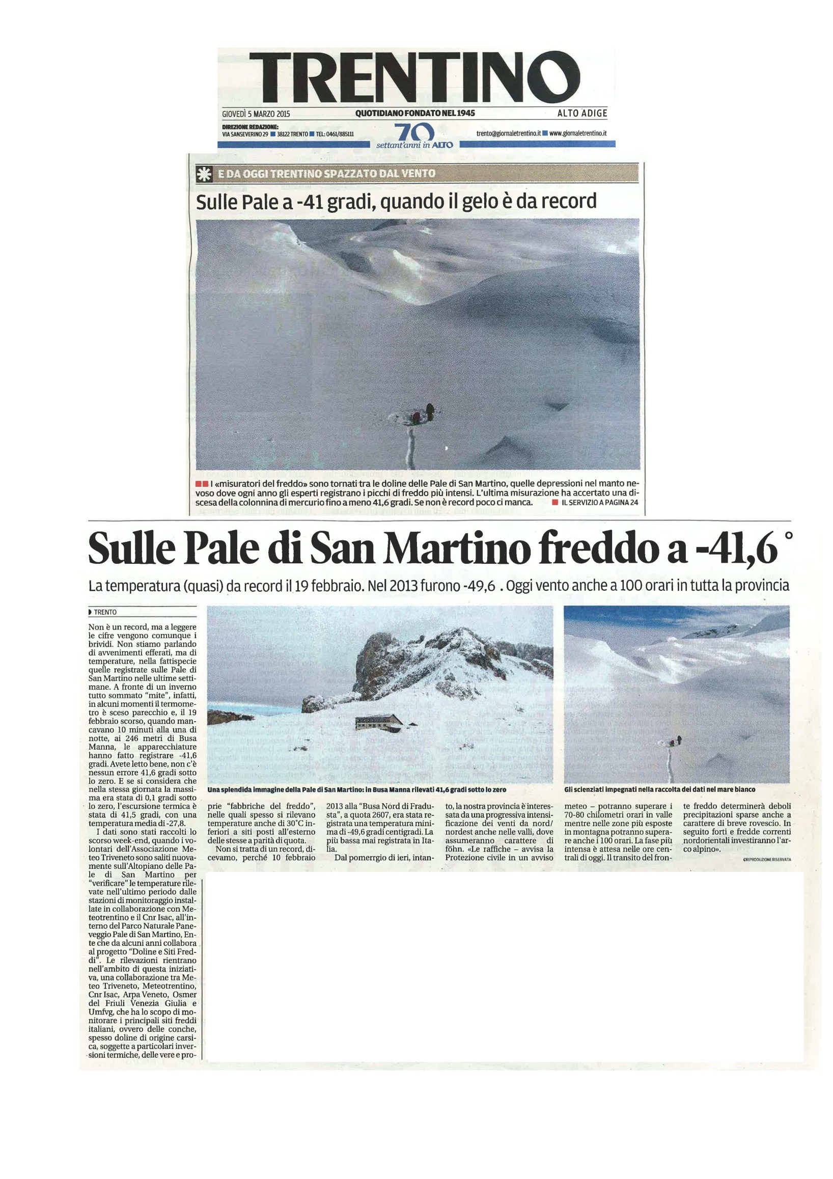 Articolo relativo al Comunicato Stampa predisposto dal sottoscritto per conto di Meteo Triveneto congiunto con Meteotrentino e relativo ai monitoraggi effettuati nell'ambito del progetto doline e siti freddi di Meteo Triveneto.